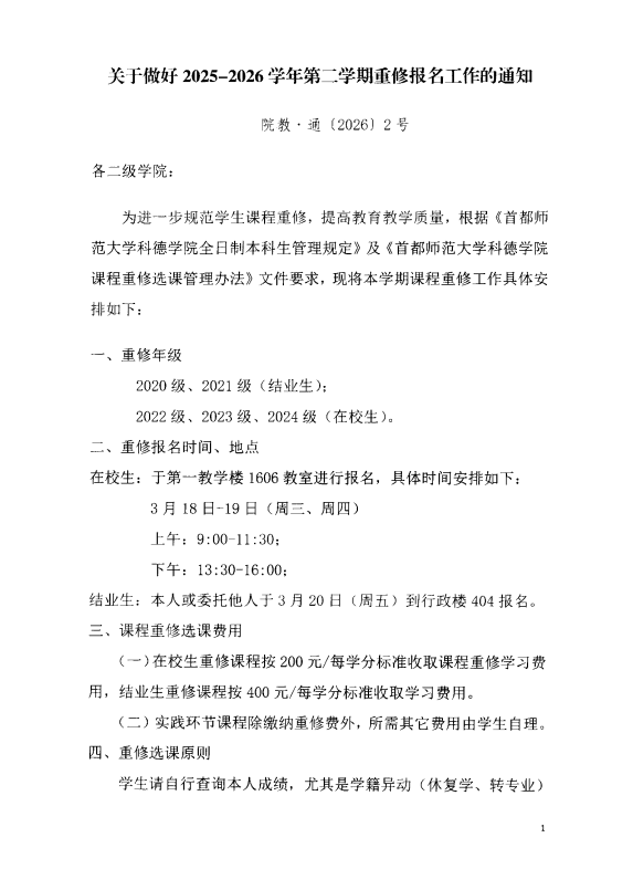 关于做好2025-2026学年第二学期重修报名工作的通知