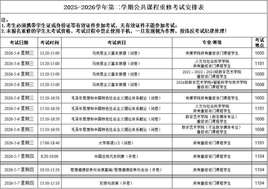 2025-2026学年第二学期公共课程重修考试安排表